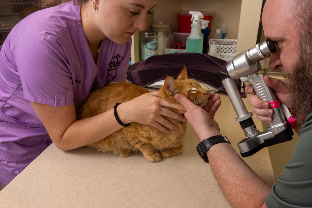 We have a Tono-pen to measure ocular pressure, one of a few in the region, and a handheld indirect lens which provides a panoramic view of the retina. With these instruments and tests we can diagnose and treat most ocular conditions. This information is also helpful for facilitating referrals to a board certified veterinary ophthalmologist, if needed.